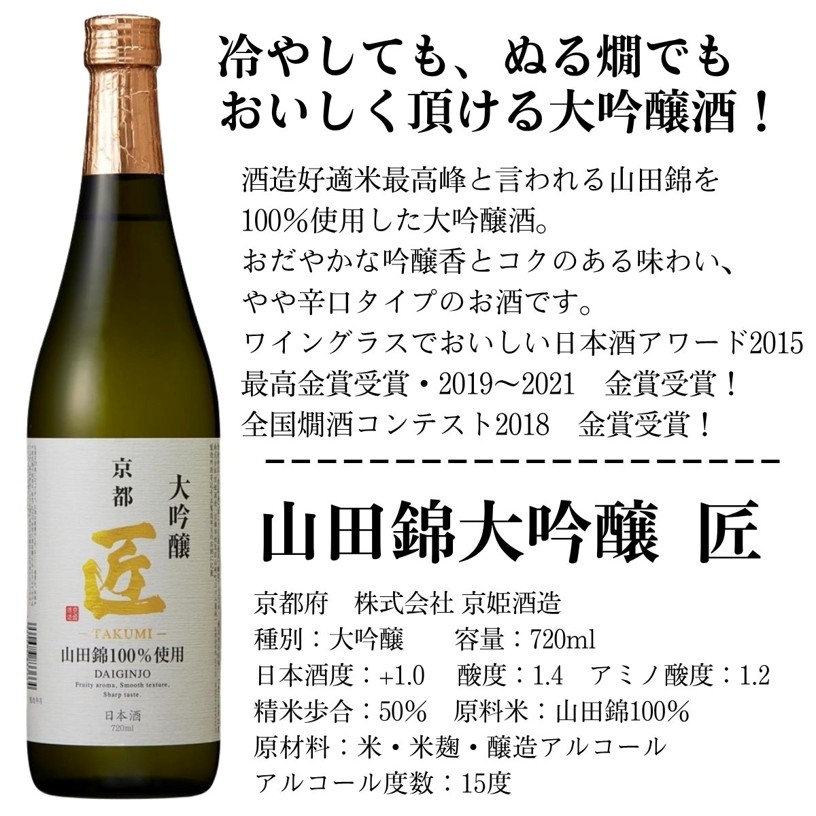 京姫 山田錦大吟醸匠は酒造好適米最高峰と言われる山田錦を100%使用した大吟醸酒。