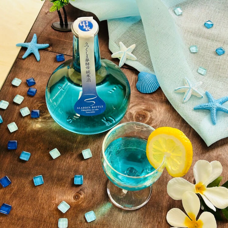 おしゃれなブルーのアラジンボトルが目にも楽しい、フルーティーな香りの純米酒です。