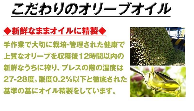 収穫:手摘み造り:収穫後低温で保管、12時間以内にプレスを行い
